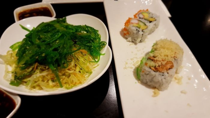 جانب قائمة السوشي الكبيرة، السالمون والقريدس اللذيذ والمحار والنودلز الصيني، والكيمباب
